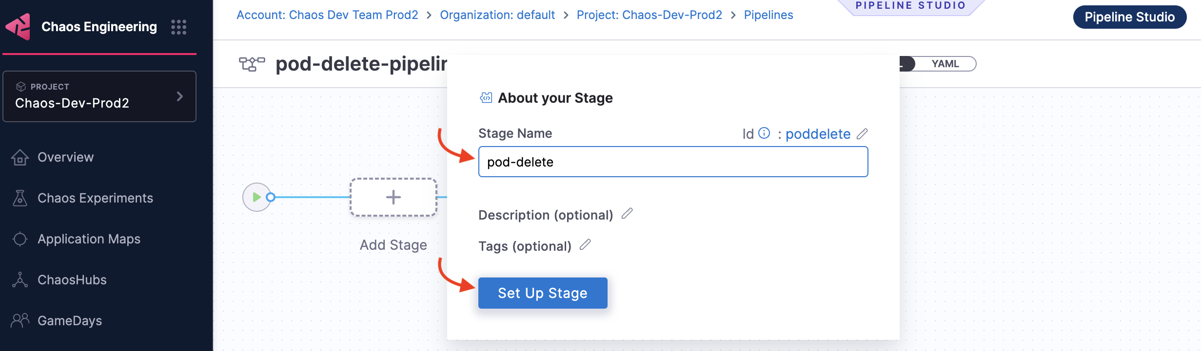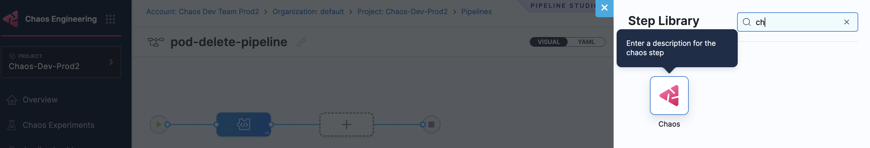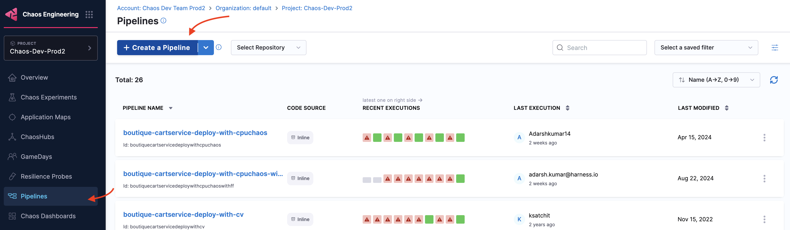 1. Go to Chaos module and select Pipelines and click +Create a Pipeline.