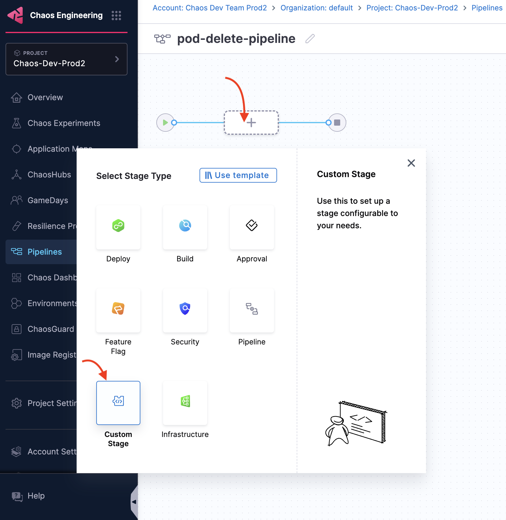 3. Click the + (the stage type), and select Custom Stage.
