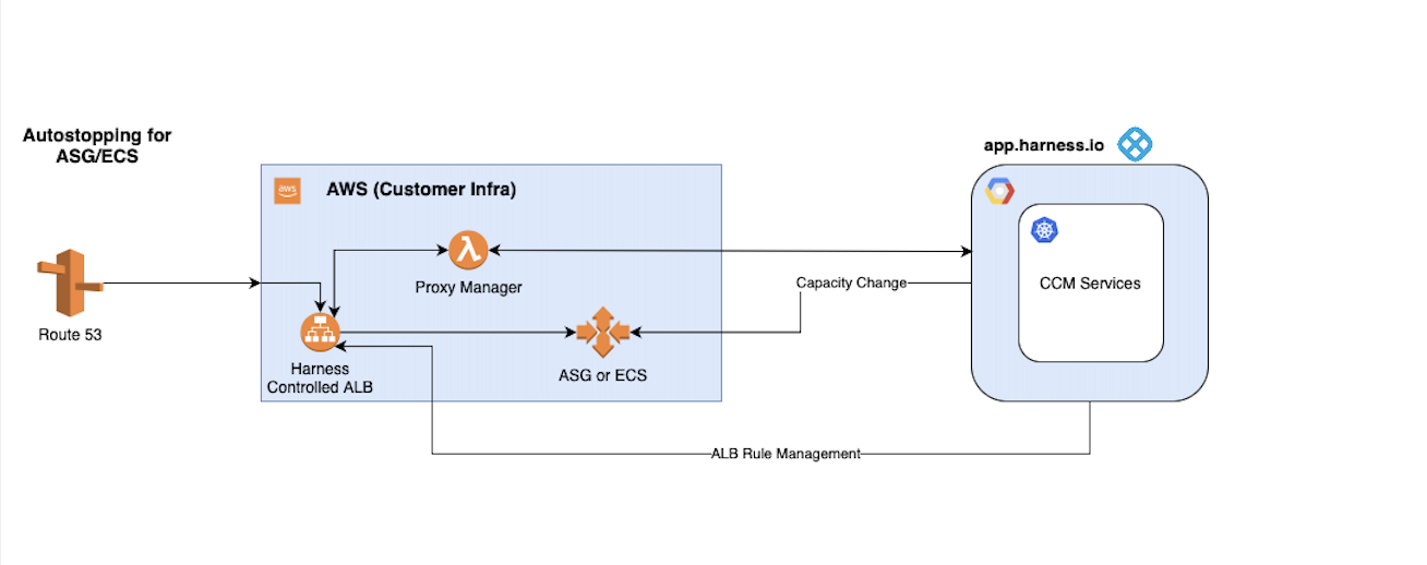 In this high-level depiction, we illuminate the dynamic interplay between CCM services and customer infrastructure, highlighting the orchestrated process of AutoStopping for AWS ECS and Auto Scaling Groups. The onboarding journey involves Harness assuming the role of managing an existing Application Load Balancer (ALB) within the customer environment. If no ALB exists, Harness takes charge of creating a new one. Additionally, a freshly instantiated Proxy Manager enters the scene to meticulously track traffic directed towards the target resources.