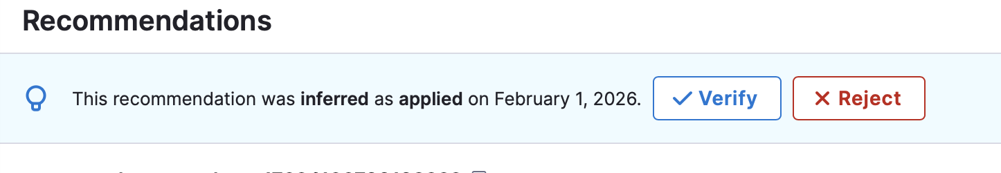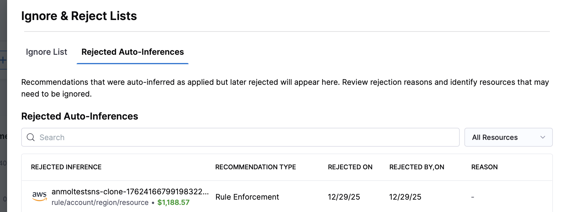- Rejected Auto-Inferences: Recommendations that were auto-inferred as applied but later rejected will appear here. Review rejection reasons and identify resources that may need to be ignored. You can see the rejected inference, recommendation type, rejected on, rejected by and on and the reason for rejection.
