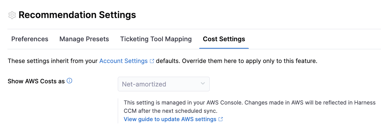 Users can choose to see AWS costs as per their preferences.These settings inherit from your Account Settings defaults. You can override them to apply only to this feature. This setting is managed in your AWS Console. Changes made in AWS will be reflected in Harness CCM after the next scheduled sync.
