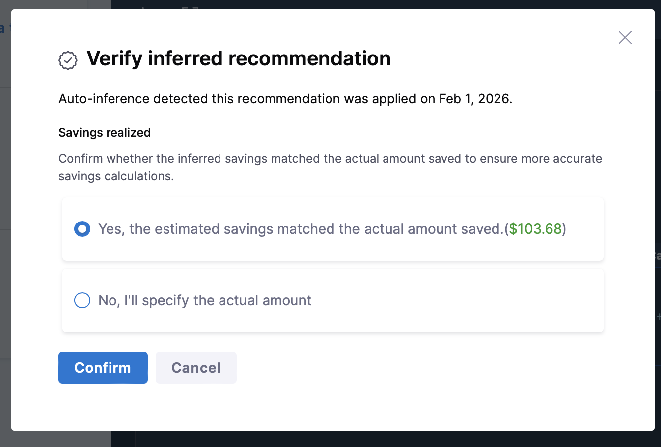 - Automatically Detect when recommendations are applied: When enabled, Harness will analyze billing data to automatically identify when recommendations are applied, without having to manually mark them as applied.