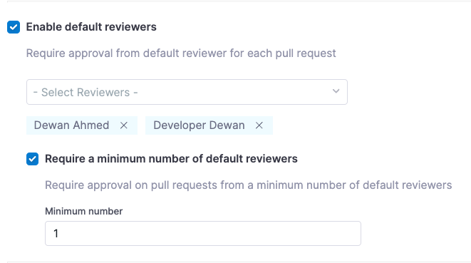 | Enable default reviewers | Automatically assigns default reviewers to new pull requests. Optionally, enforce a minimum number of approvals from default reviewers before merging. Details. |