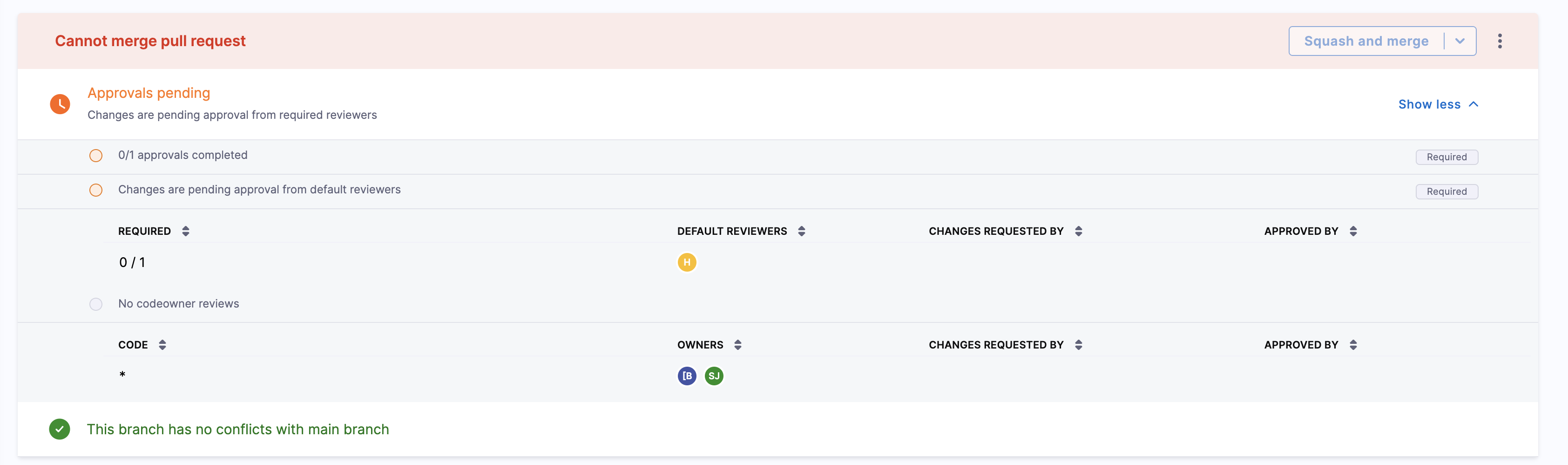 If a minimum number of approvals from default reviewers is required, the PR cannot be merged until at least that many approvals are received. This requirement is displayed in the Approvals section of the PR summary.