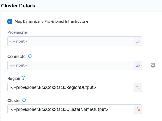In the Harness Infrastructure Definition, you map outputs to their corresponding settings using expressions in the format <+provisioner.STACK_NAME.OUTPUT_NAME>, such as <+provisioner.EcsCdkStack.RegionOutput>.