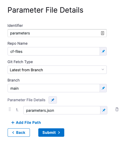 - Parameter File Details: enter the path to the file from the root of the repo. To add multiple files, click Add Path File.