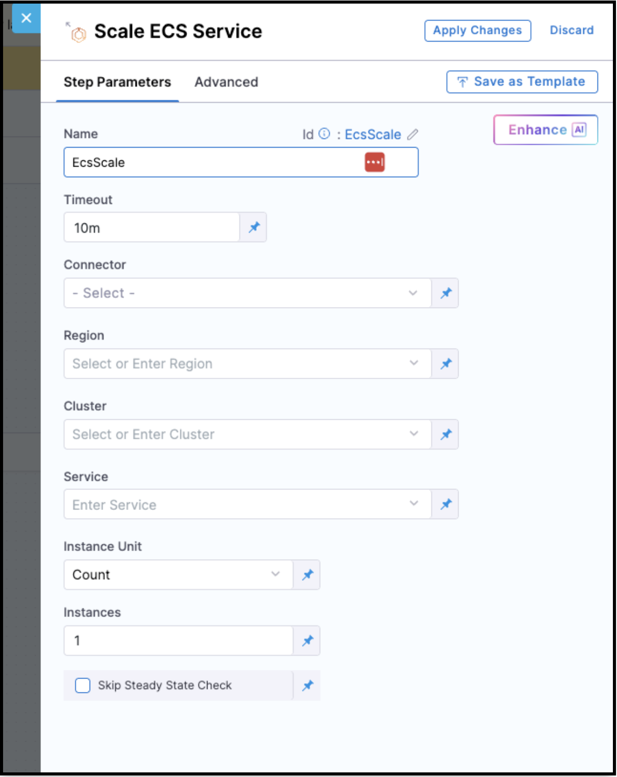 The ECS Scale step lets you scale any ECS service running in a cluster — independent of your deployment execution. Instead of triggering a full deployment stage to adjust instance counts, you can add this step to any pipeline and target any service in any ECS cluster you have access to.