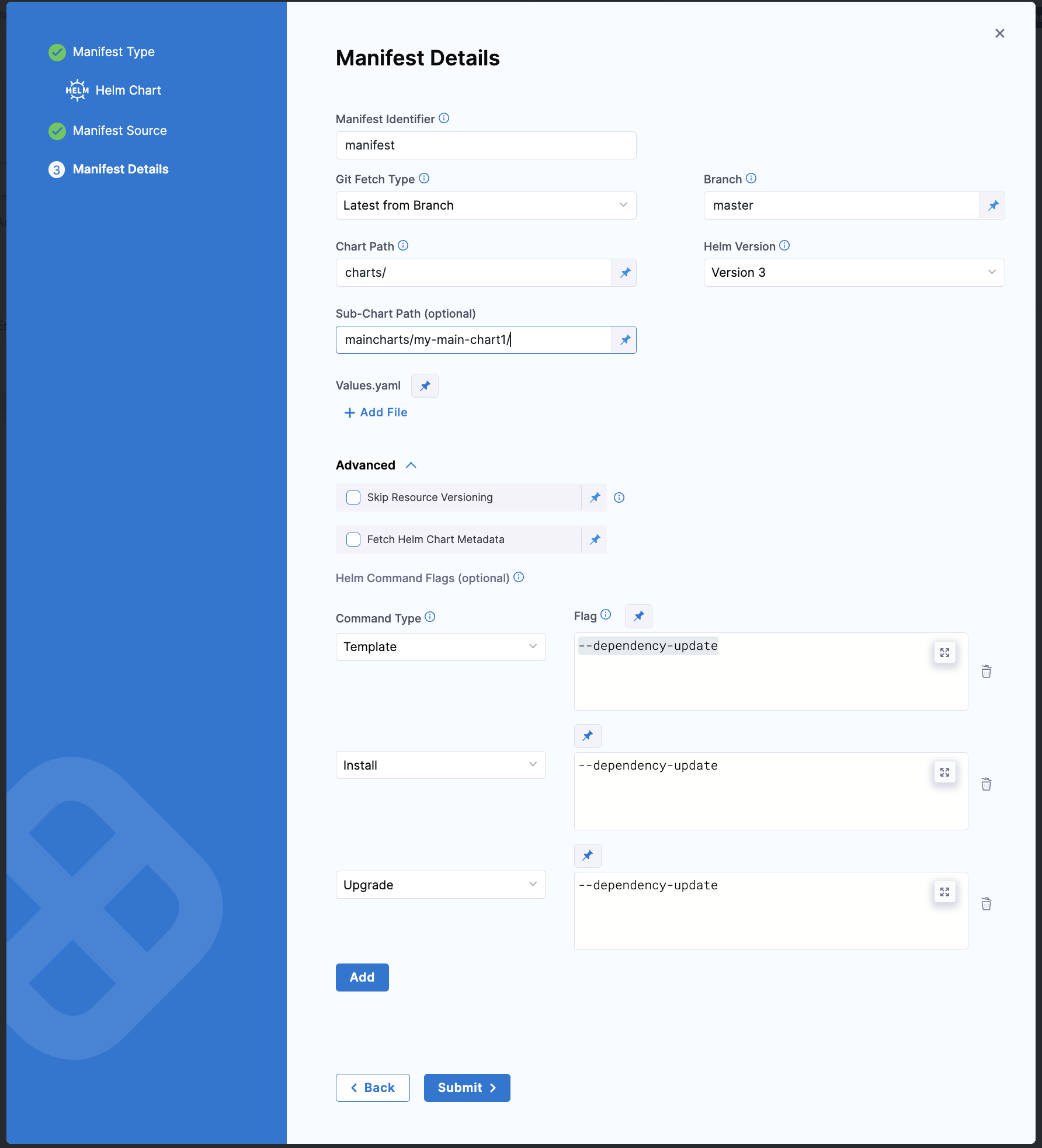 --dependency-update -f secrets.yamlcommand flag in the manifest configuration to resolve the values. Please remember that files submitted through this method take precedence, followed by the override files set in the Harness service. Avoid using encrypted files as overrides as they will replace decrypted values with encrypted ones. An example on how to configure this is shown in the image below: