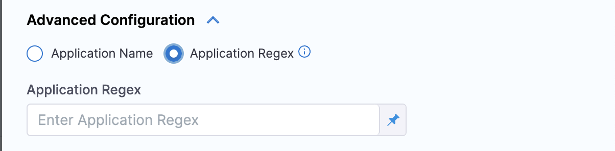 In Advanced Configuration, select the application you want to sync and configure the sync options. You can either choose an application or applications manually, or you can match up to 1000 applications using a regex filter. The regex field uses Go (Golang) regex syntax — not JEXL. You can test your patterns at regex101 with the Golang flavor selected.