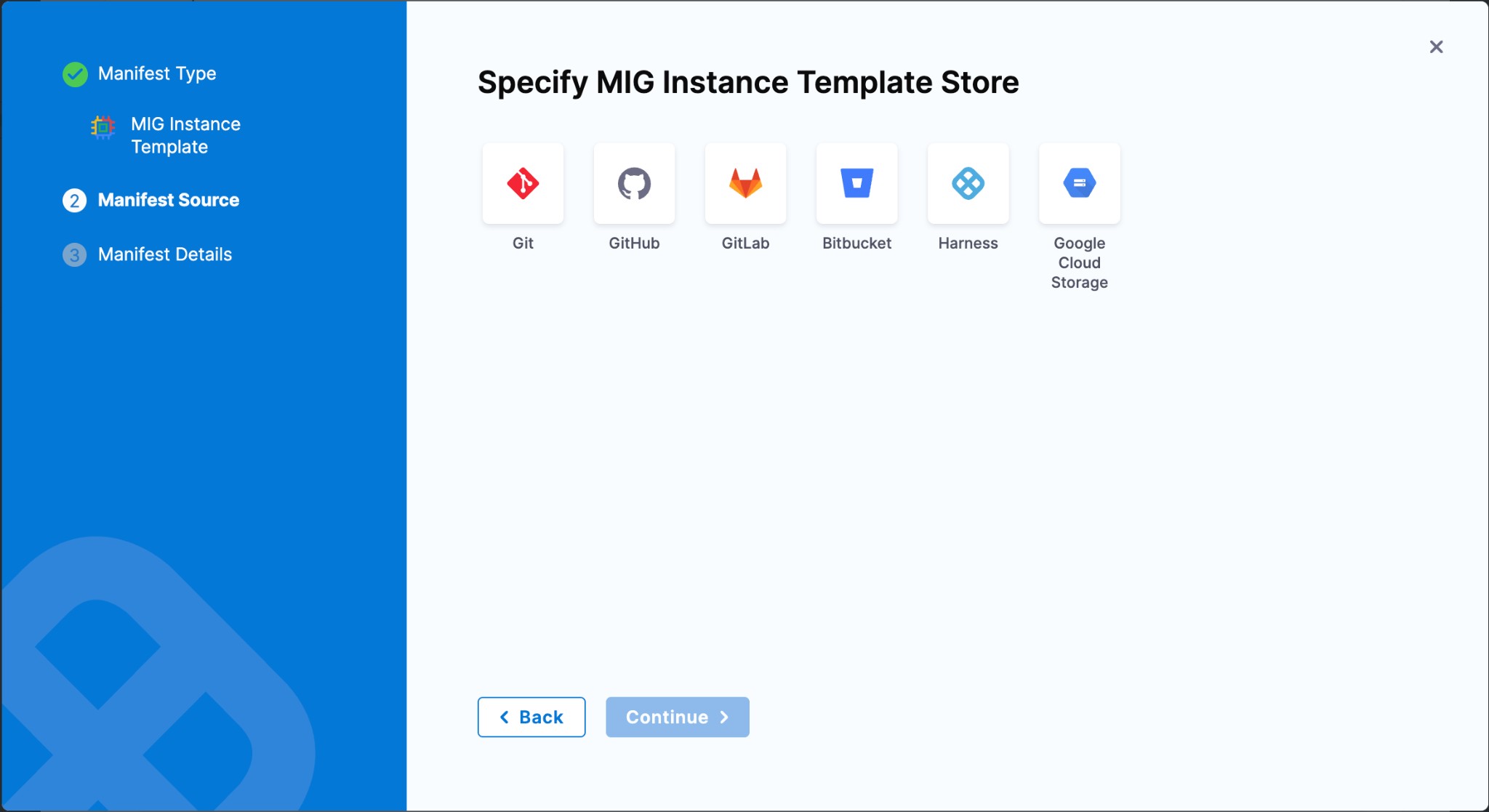 When adding a manifest to your MIG service definition (Instance Template, MIG Configuration, Autoscaler, or Health Check), Harness prompts you to choose a manifest store. Select Google Cloud Storage from the available options.