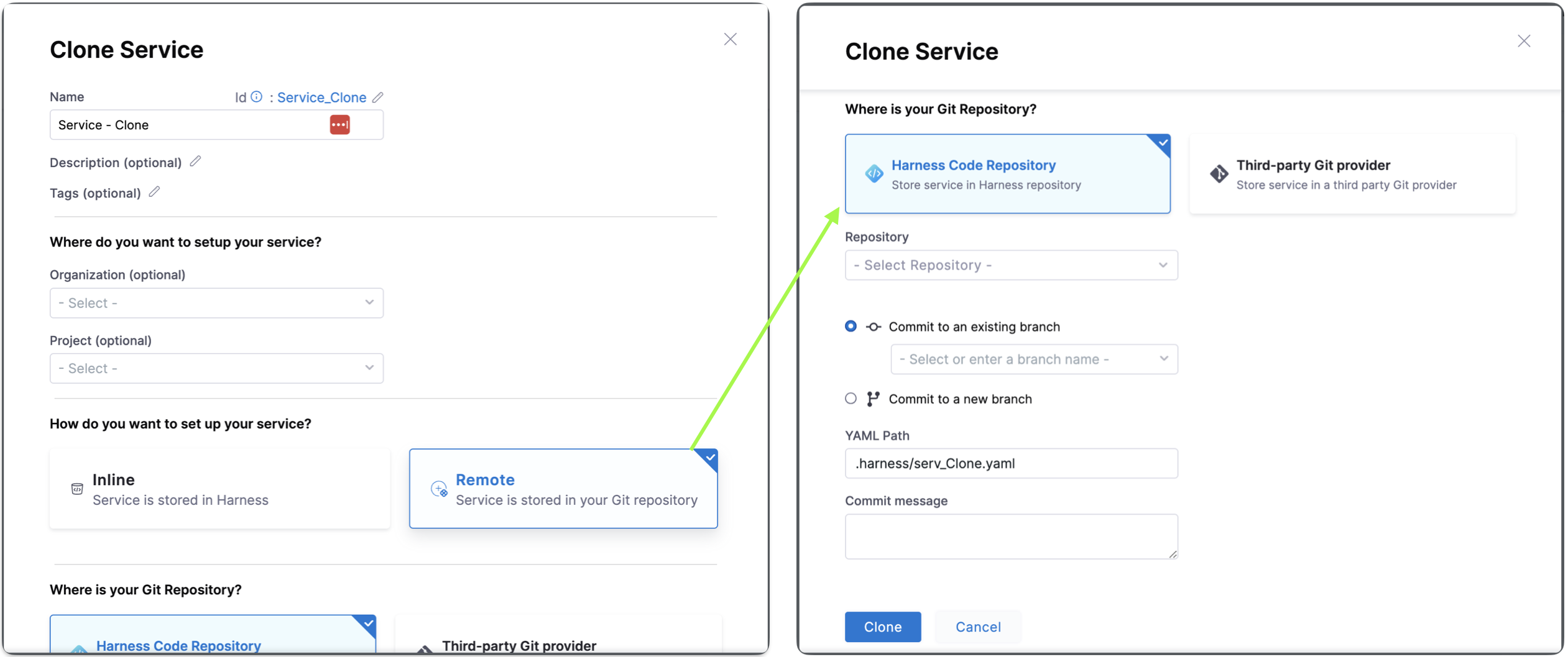To clone an inline service or remote service to a remote service, you must specify the target repository, Harness Code Repository to store the service in the Harness repository or Third-party Git provider to store the service in a third party Git provider, define the Git Connector if Third-party Git provider. Specify the Repository name, the YAML path, and the commit message.