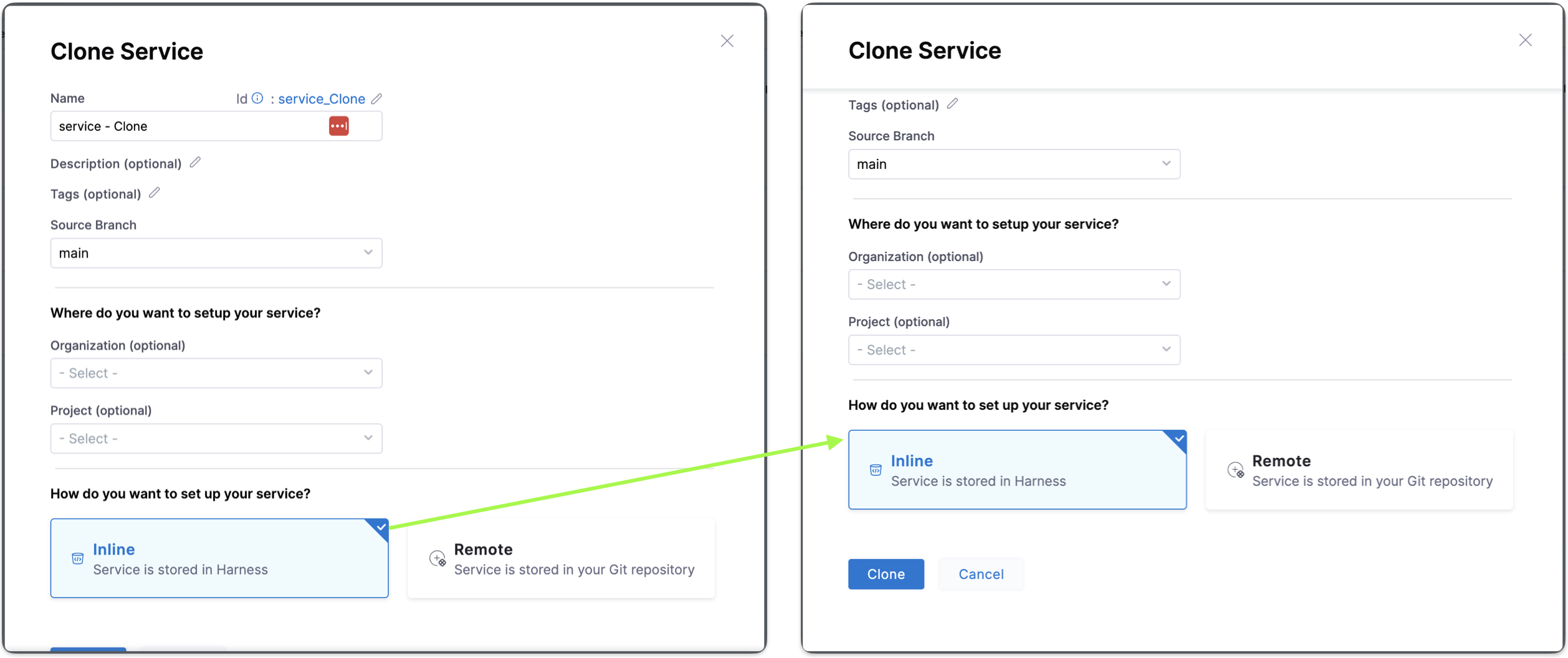To clone a remote service to an inline service, you have to specify the source branch where the remote service is stored.
