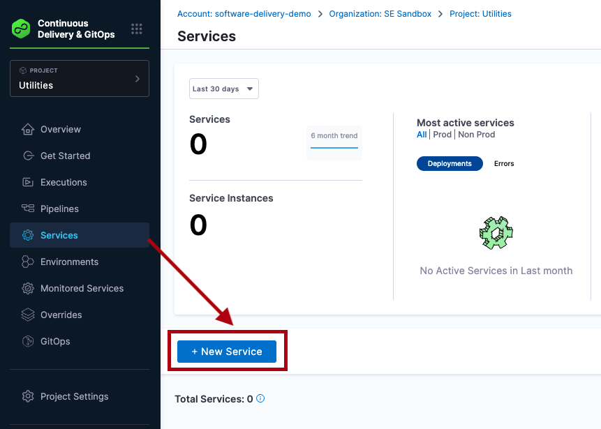 To create a service from inside of a pipeline, select the Services tab of a new CD stage, then select New Service.
