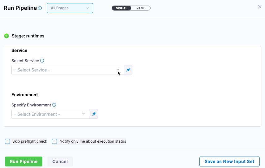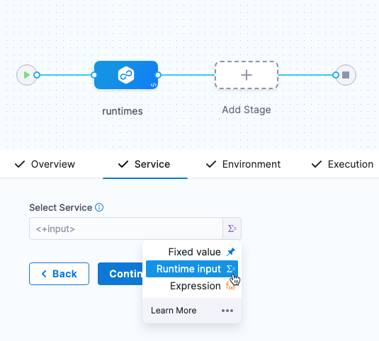 However, when using a deployment stage in a pipeline that has service configured as a runtime input, you can pick services from project, organization, or account levels to pass them as runtime inputs based on your RBAC.