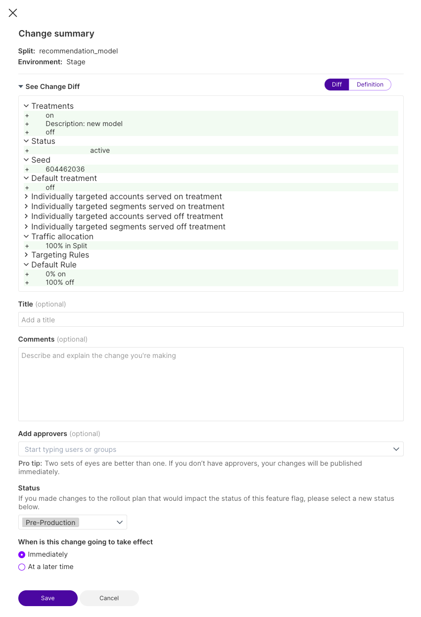 When you click review changes after making a change to a feature flag, segment, or metric, a panel displays offering a diff view of the changed elements. You can enter a title and comments for the change made to make it easier for teammates to understand why the change was made. If you want to make titles and comments required for all changes in a project, refer to the Projects guide for more information.