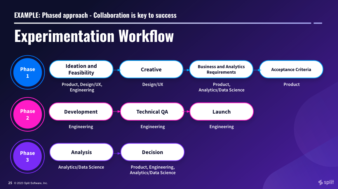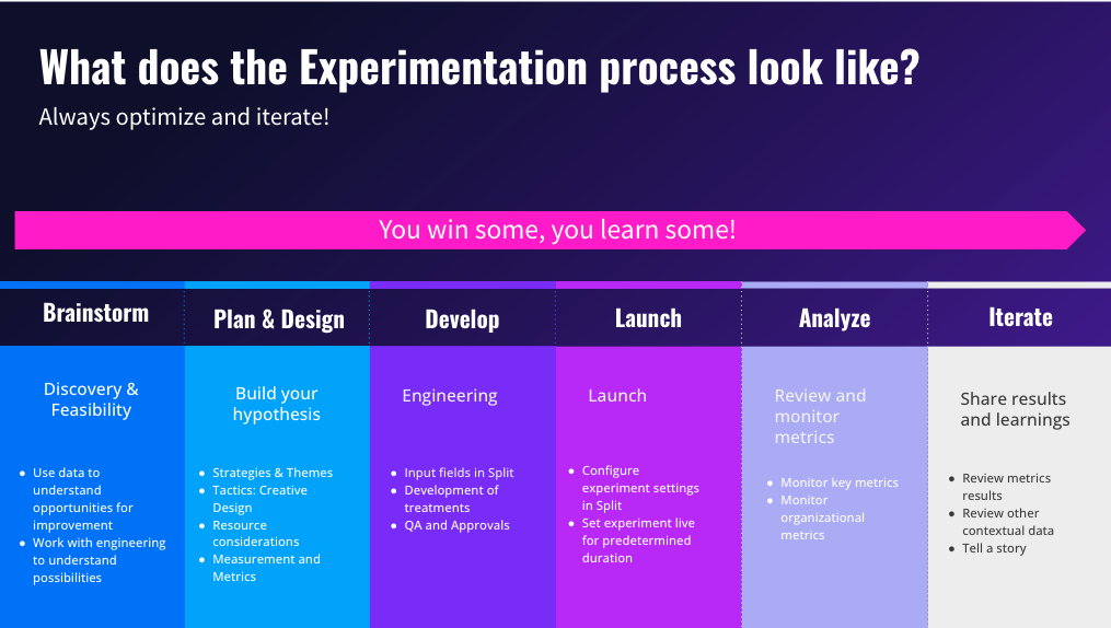 For any experimentation program to be successful, teams should be able to remain agile and create repeatable steps. These steps give teams an outline for the who, what, when and where of experimentation. From conception to iteration, it is important that teams optimize the process itself as they go along, in order to move faster.