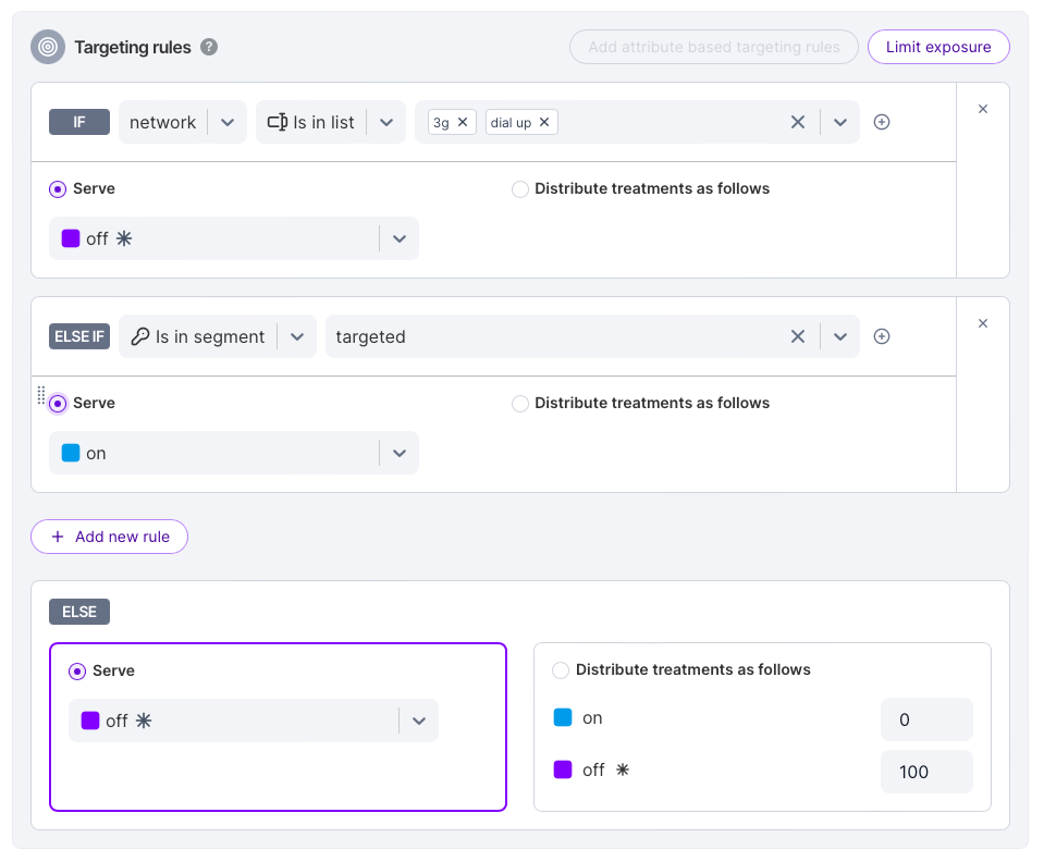 For example, if you have a rule that individually targets users by ID or segment, but you need to give certain users a different treatment based on an attribute (such as slow network speed), create a higher-priority rule for that attribute.