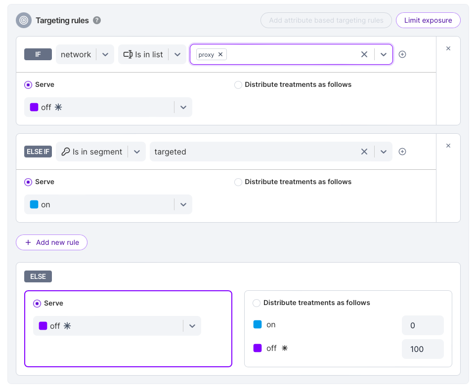• Click Add attribute based targeting rules to assign individual users or segments to a selected treatment or percentage distribution.