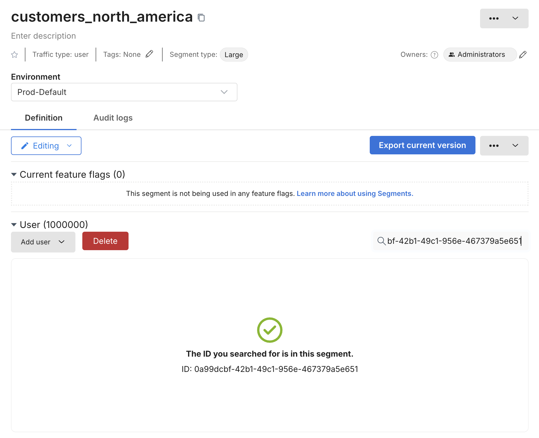 Refresh the Segment page to see the segment size updated. You can search for a user ID to confirm that it is in the Large segment.