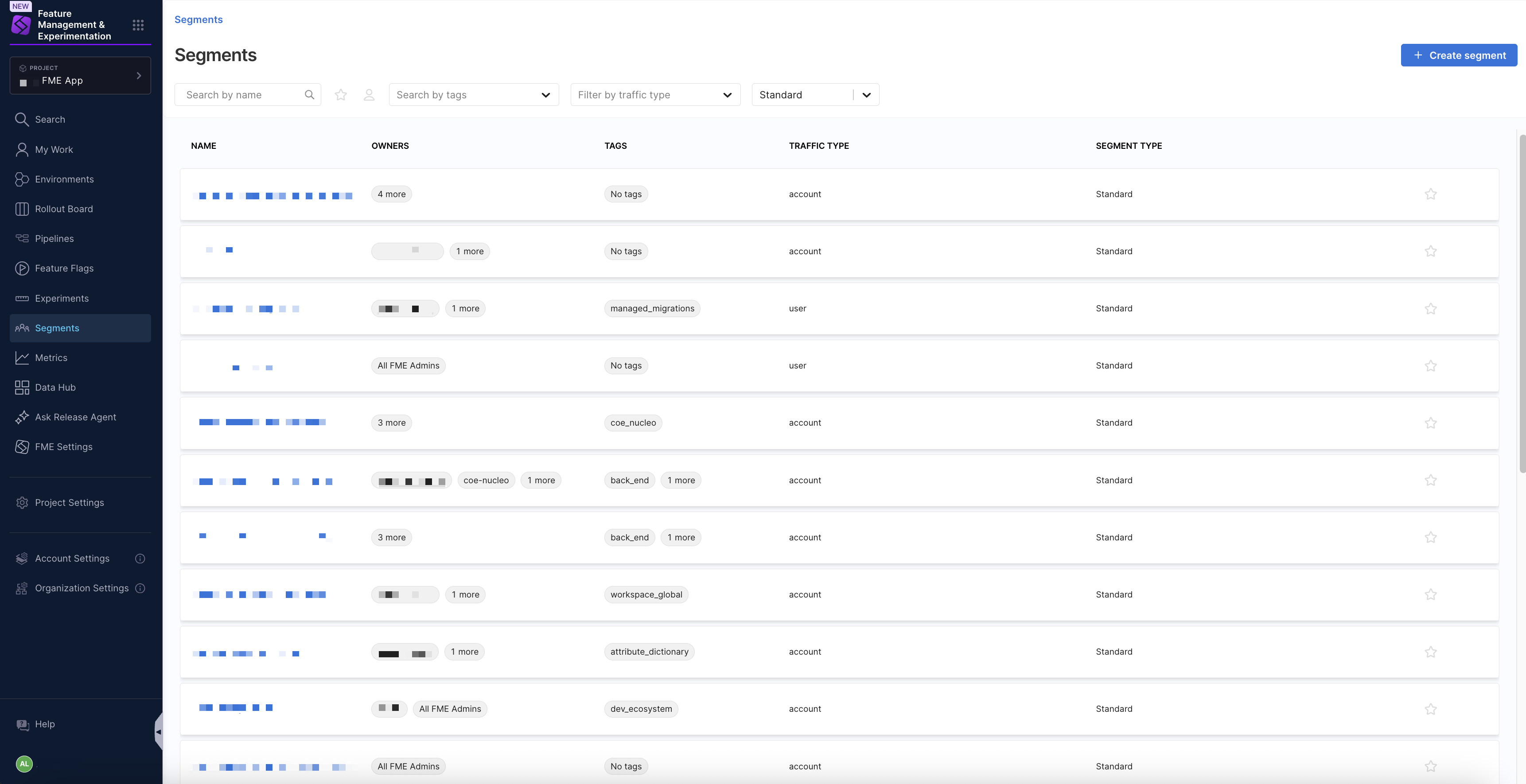 The Segments page in Harness Feature Management & Experimentation (FME) provides a centralized list view for searching and managing your segmentsSegments are groups of users defined by specific attributes or behaviors. They allow you to target feature flags and experiments to specific subsets of your user base.. You can search, filter, and organize segments before drilling into an individual segment's definition.
