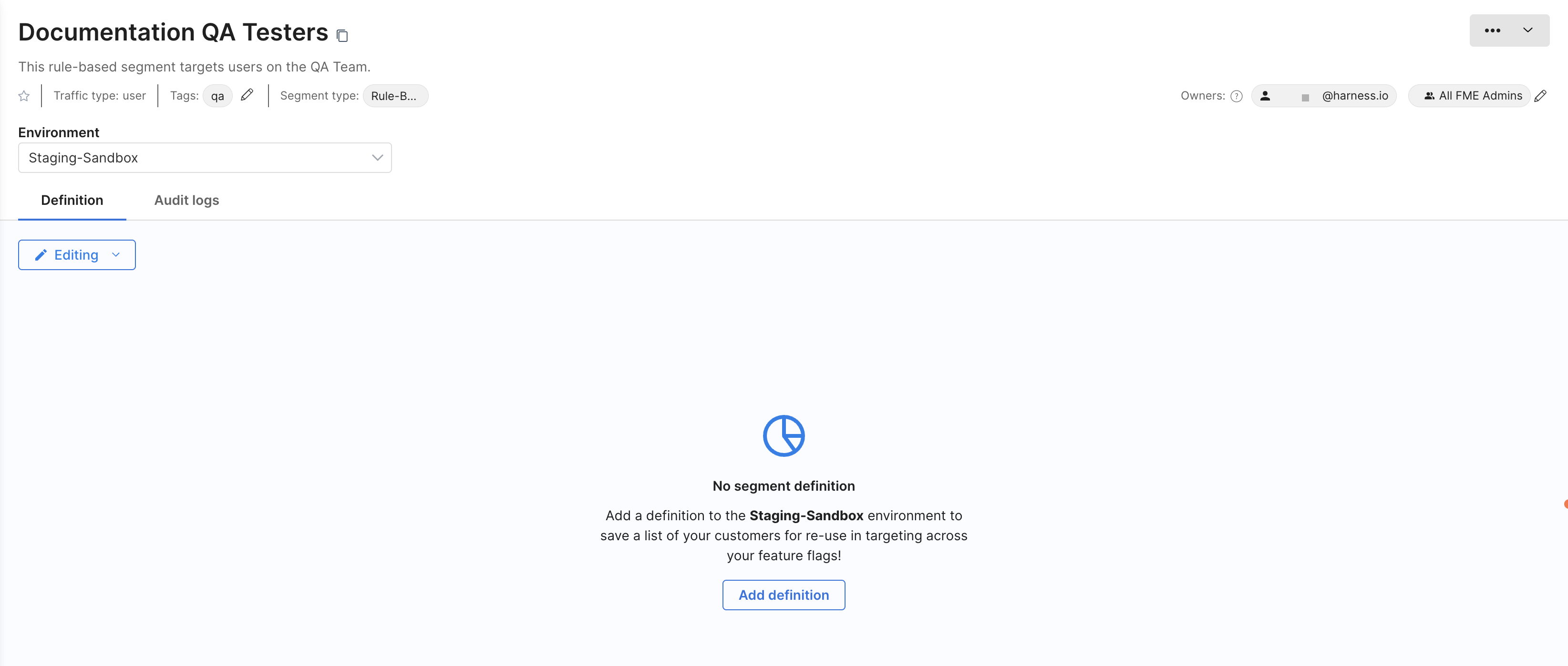- Click Create to create your new segment. This takes you to the segment details page with the Definition and Audit Logs tabs.
