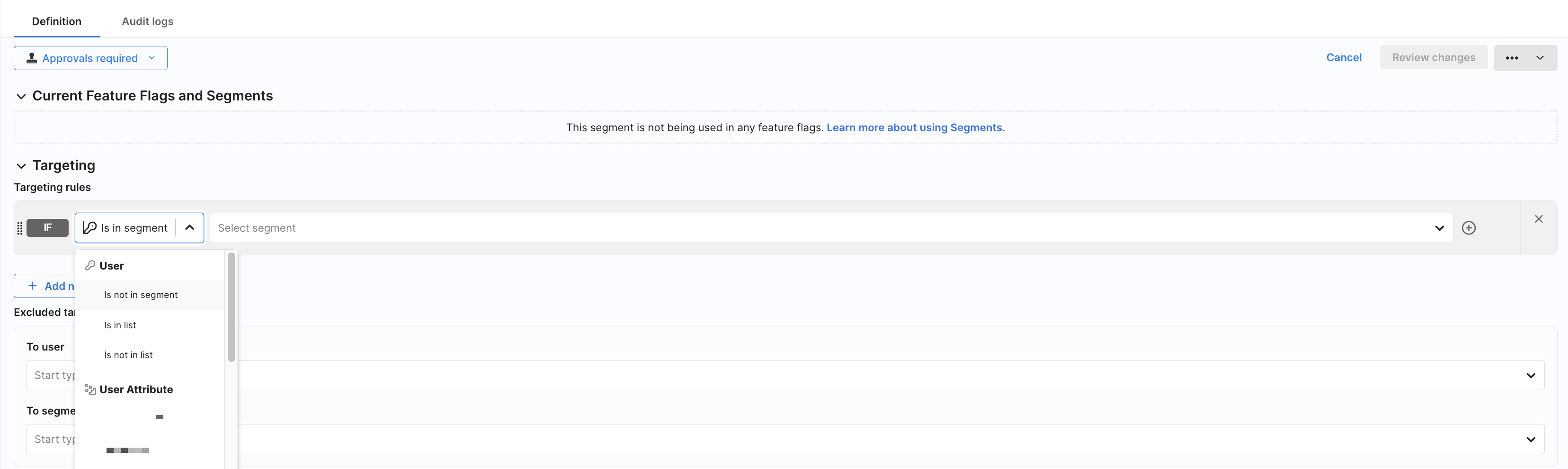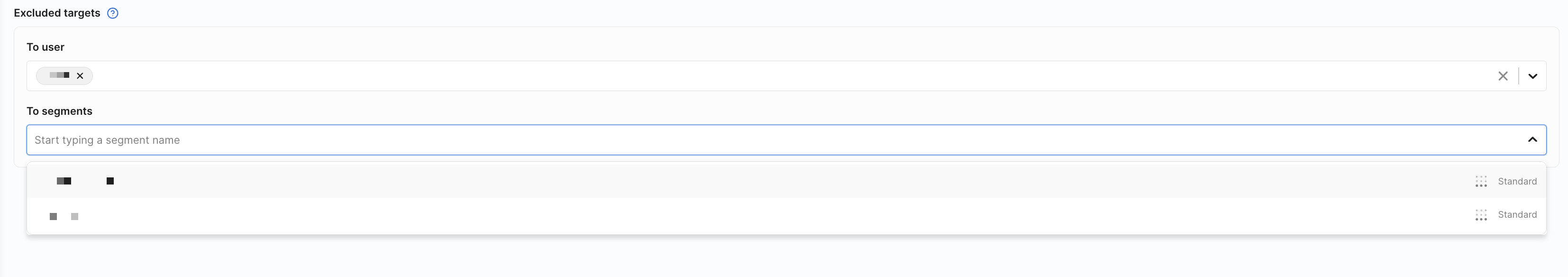 In the Excluded targets section, you can exclude users or segments from the segment definition, even if they match the targeting rules. Excluded targets are always removed from the final segment membership.