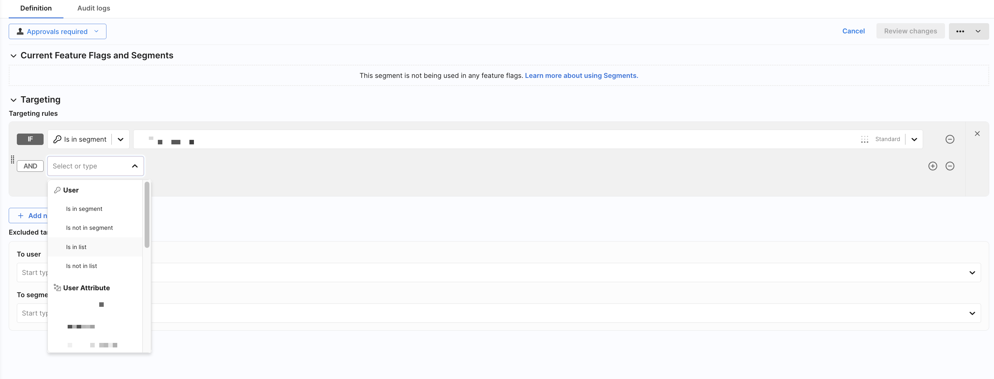 - Audit logs, where you can review changes made to a segment over time