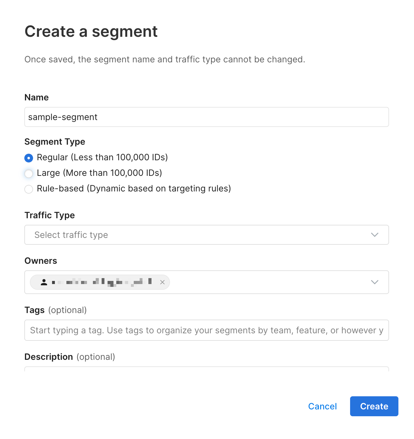 When creating a segment, the segment name, description, owners, and tags can help you and your team later manage your segment. This information can be customized to your team's workflow.