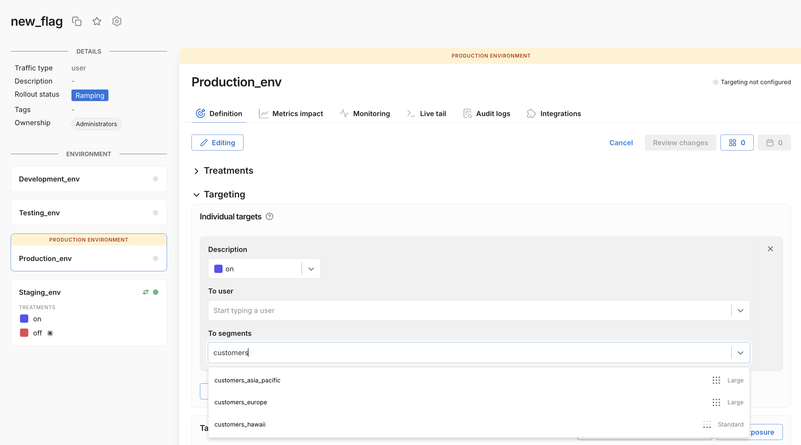 Segments are lists of user IDs. In a feature flag definition, you can assign treatments to one or more segments in your targeting rules. If a segment does not appear in search, it may not be defined in the selected FME environment.