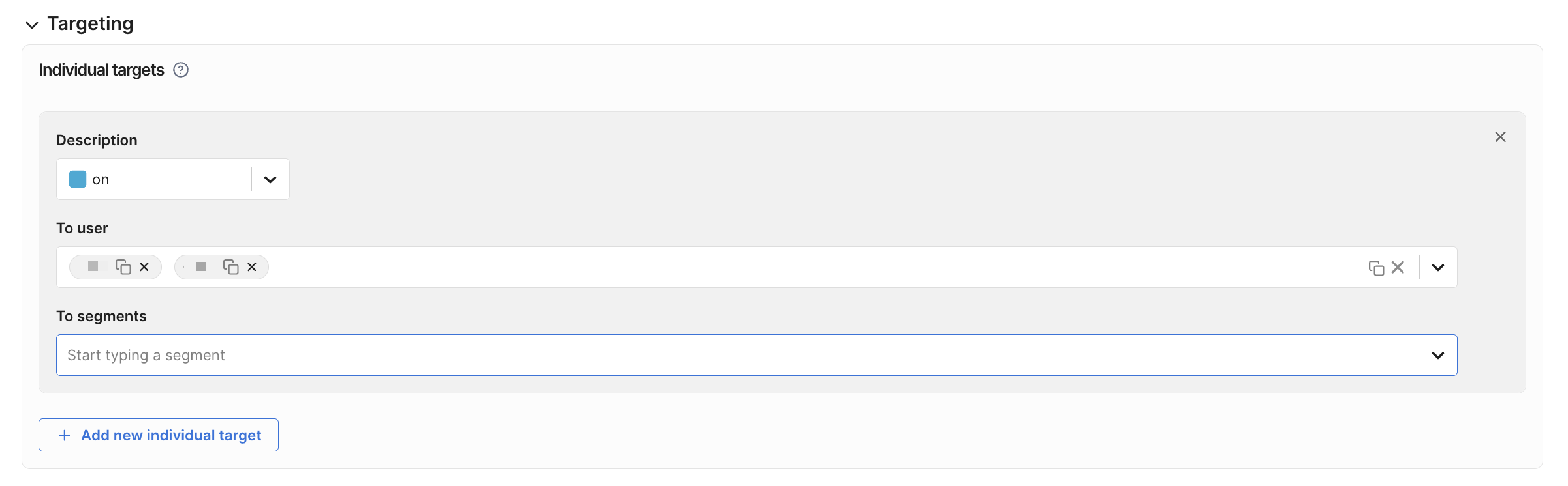 Once you create a feature flag, you can create feature flag targeting rules that target individual user IDs (or user keys), or use segments to target groups of users.