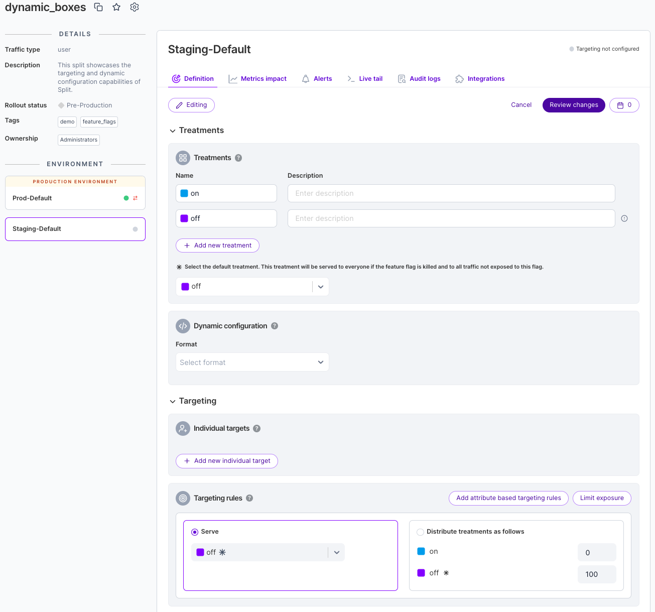 We can choose this feature flag, which is rolling out a new feature for doing course registrations. At the moment, there are two treatments, either you get the new feature, or you don’t, in this case based on a random 50/50 flag targeting setup of all users. Otherwise, the feature is dark.