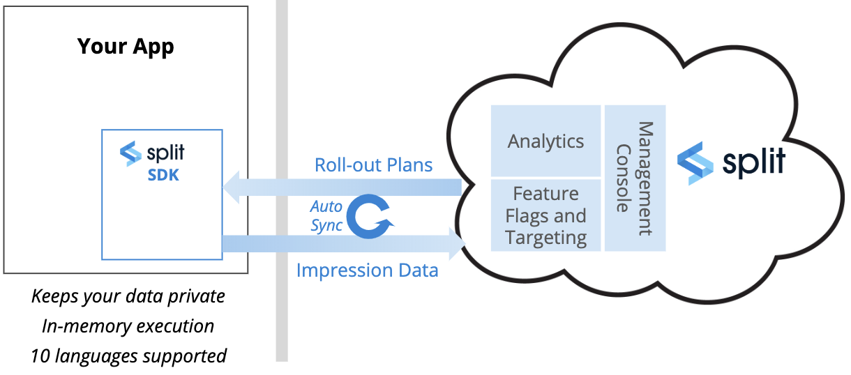 Let’s look at the data flow in a little more detail. Split provides implementation options to meet your requirements. By far, the most common is to install the Split SDK in your application, whether using JavaScript, IOS or Android on the front end or any of the most common back end platforms.
