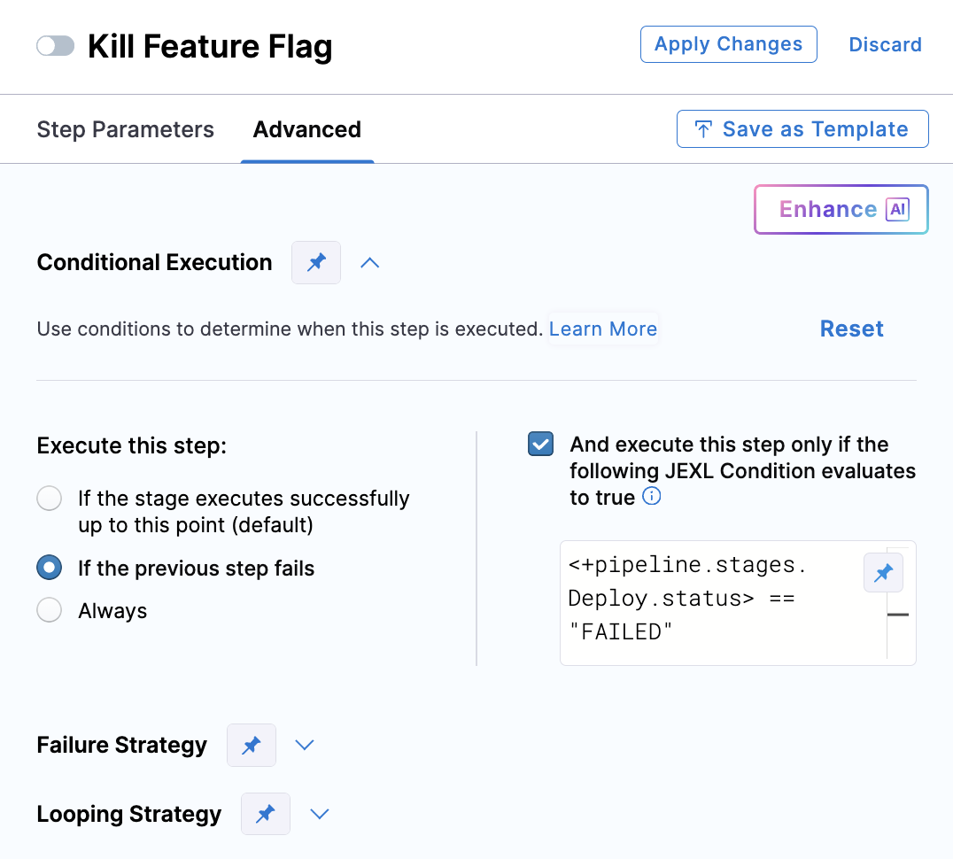 Conditional execution lets you run or skip FME steps based on pipeline variables, expressions, or runtime inputs. For example, you can update a feature flag only in production or configure a flag kill step to run only if the previous deployment step fails.