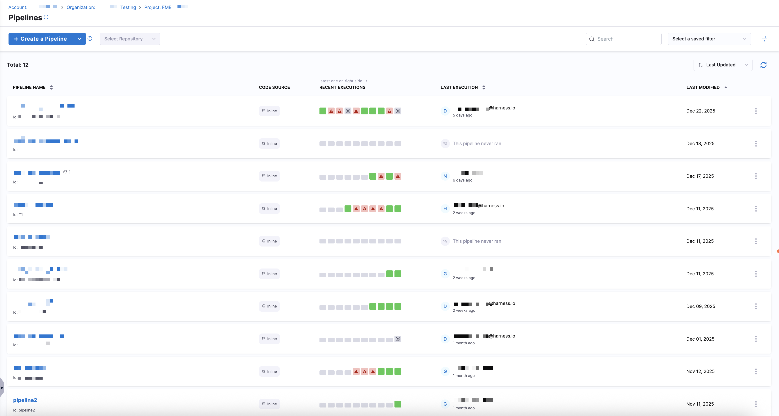 Harness Feature Management & Experimentation (FME) integrates with Harness pipelinesA pipeline is a sequence of stages that define how services are deployed to an environment. Pipelines can include approvals, barriers, notifications, and other execution logic., allowing you to include feature flag logic directly within your deployment or automation workflows. The Pipelines page in Harness FME displays a list of Harness pipelines created in your project.