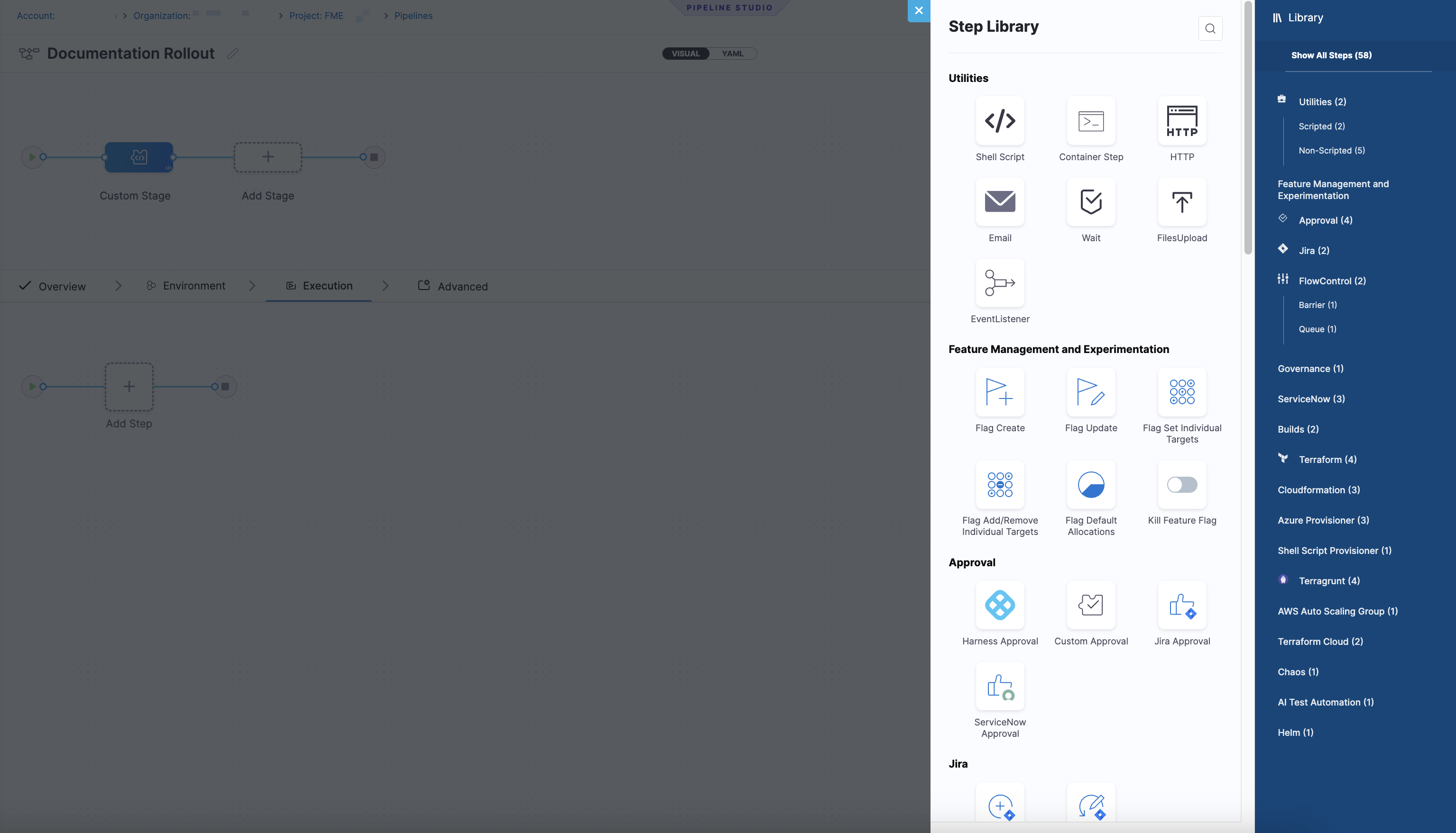 When you add a stepA step is an individual action within a stage. FME steps include operations such as creating or updating a feature flag, modifying rollout behavior, or killing a flag. to a Custom stageA custom stage is a user-defined stage in a pipeline that allows you to run custom logic or actions as part of a pipeline. FME steps are only supported in Custom stages. in the Pipeline Studio, the Step Library includes a Feature Management & Experimentation section with FME-specific steps.