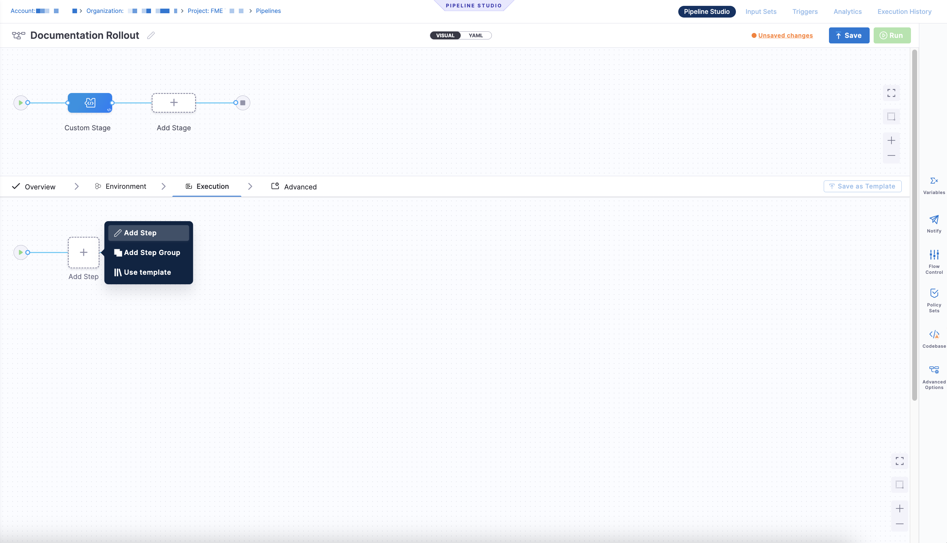 The Visual tab lets you configure stages and steps using the UI, including adding FME steps supported in Custom stagesA custom stage is a user-defined stage in a pipeline that allows you to run custom logic or actions as part of a pipeline. FME steps are only supported in Custom stages.. Add a custom stage and click Add Step to open the Step Library.