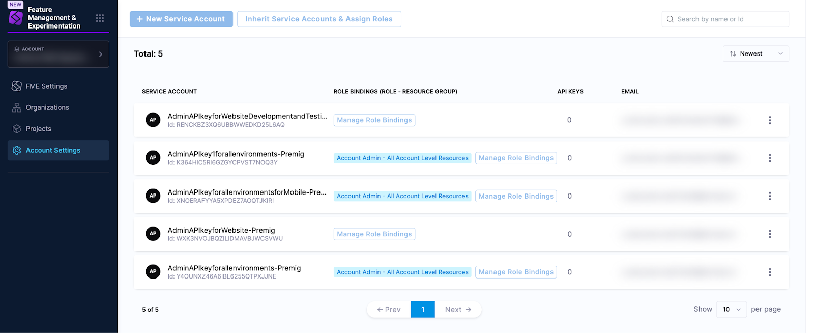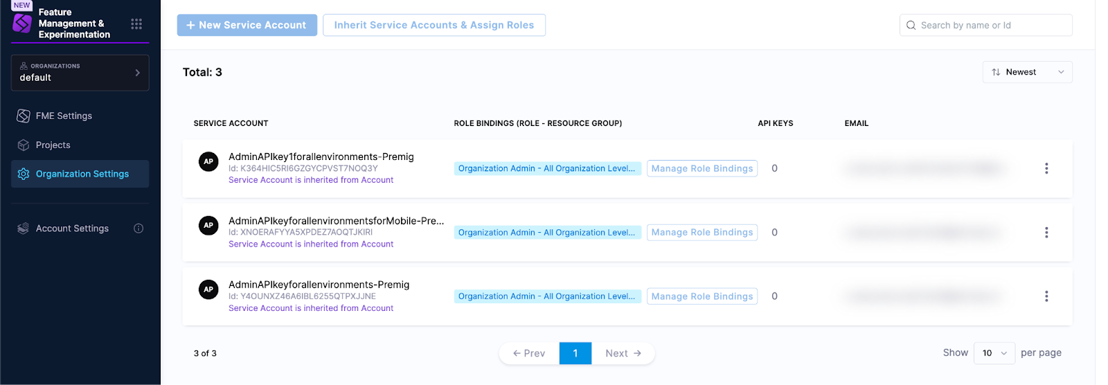 Under the Account or Organization tab*, click on the Harness service account corresponding to the legacy Split Admin API key (the name will match the name of the legacy key, shown in FME Settings, but without spaces).