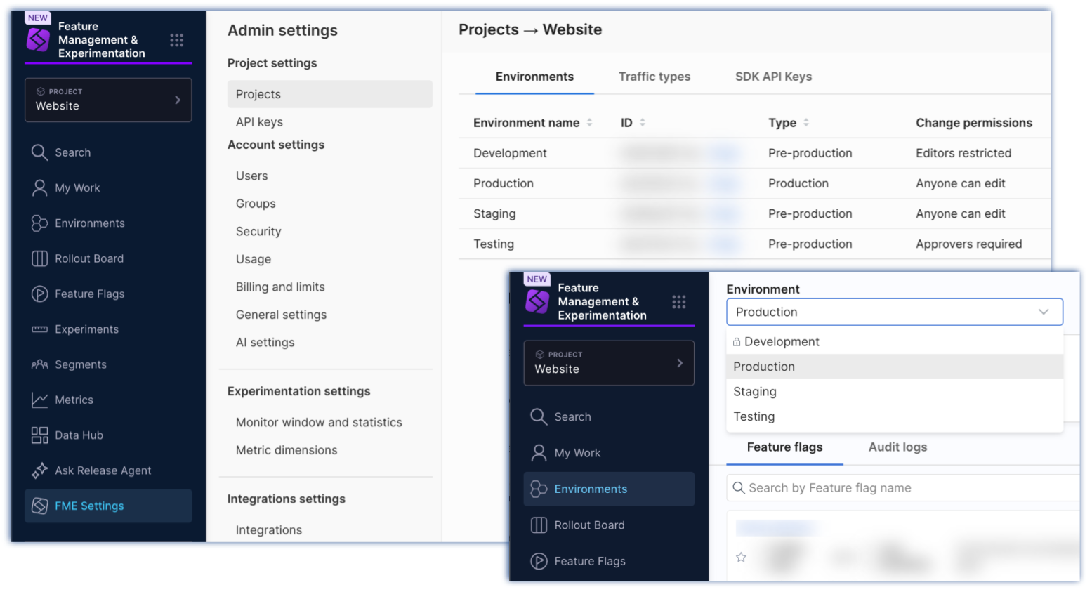 In the Feature Management & Experimentation module in Harness, FME environments are created for your project. FME environments are used to scope your FME SDK API keys, FME feature flag definitions, FME segments, and FME experiments. Within the FME module, you can access a project's FME environments from the left navigation pane, by clicking Environments or by clicking FME Settings (and then clicking the View link for a project).