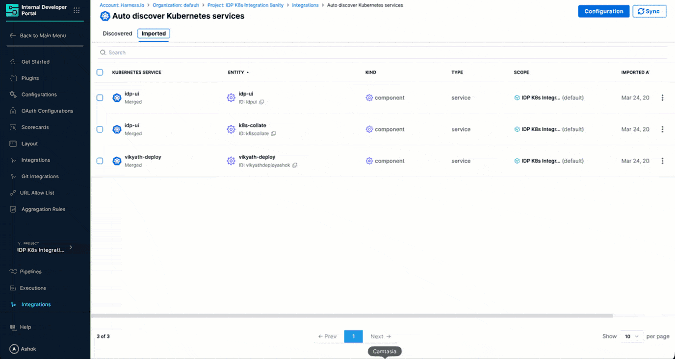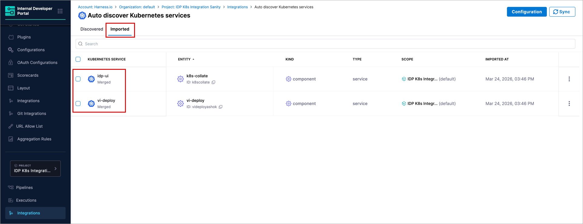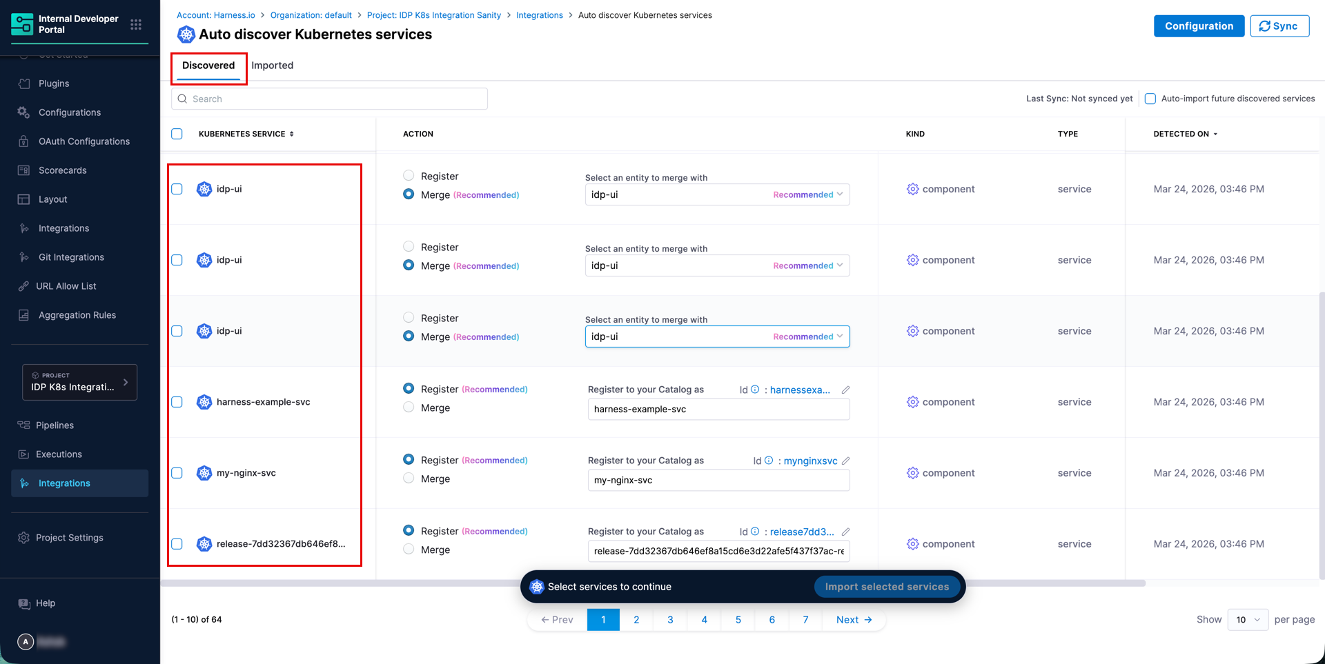 The Kubernetes integration automatically discovers services running in your Kubernetes cluster and brings them into the IDP Catalog. Once discovered, services can be registered as new catalog entities or merged into existing ones, enriching them with Kubernetes-sourced metadata for service discovery and dependency mapping.