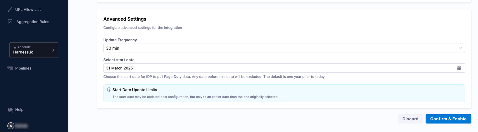 2. Set the Select start date to define the earliest date from which IDP will pull PagerDuty data. Any data before this date will be excluded. By default, this is set to one year prior to today.