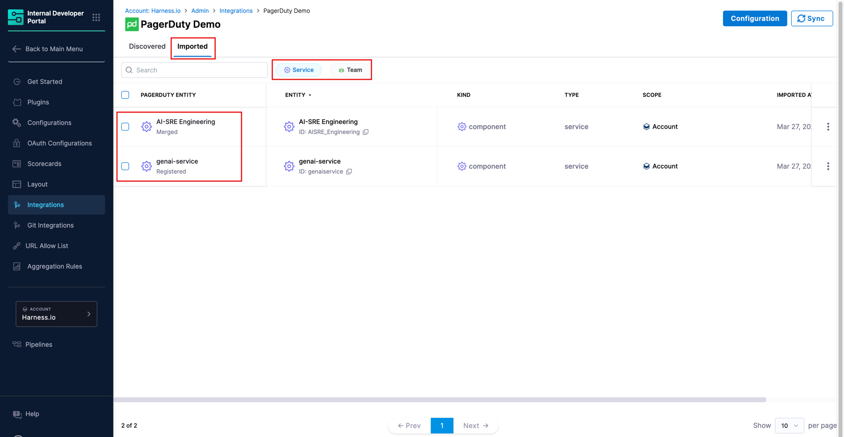Figure 9: 'Imported' tab showing the PagerDuty Services and Teams linked to the catalog entities