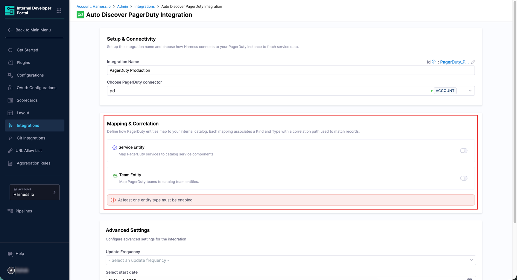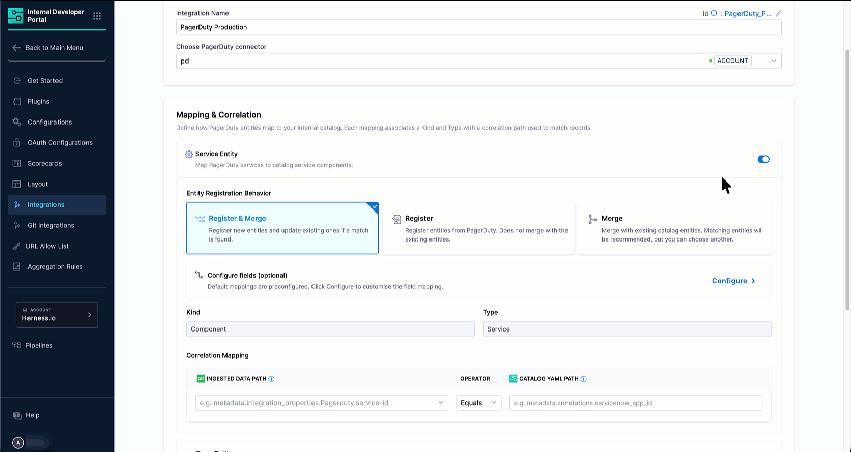 The PagerDuty integration is currently available at the Account level only. Navigate to the Account scope of the Internal Developer Portal to add or manage PagerDuty integrations.