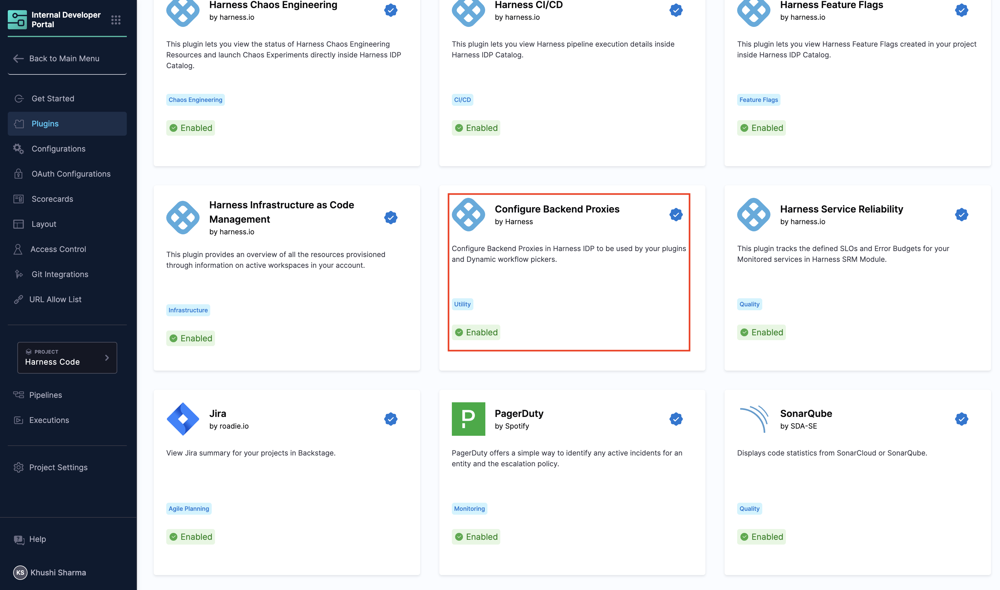 2. Under the "Plugins" page, search for "Configure Backend Proxies" by Harness IDP. Ensure this plugin is enabled.