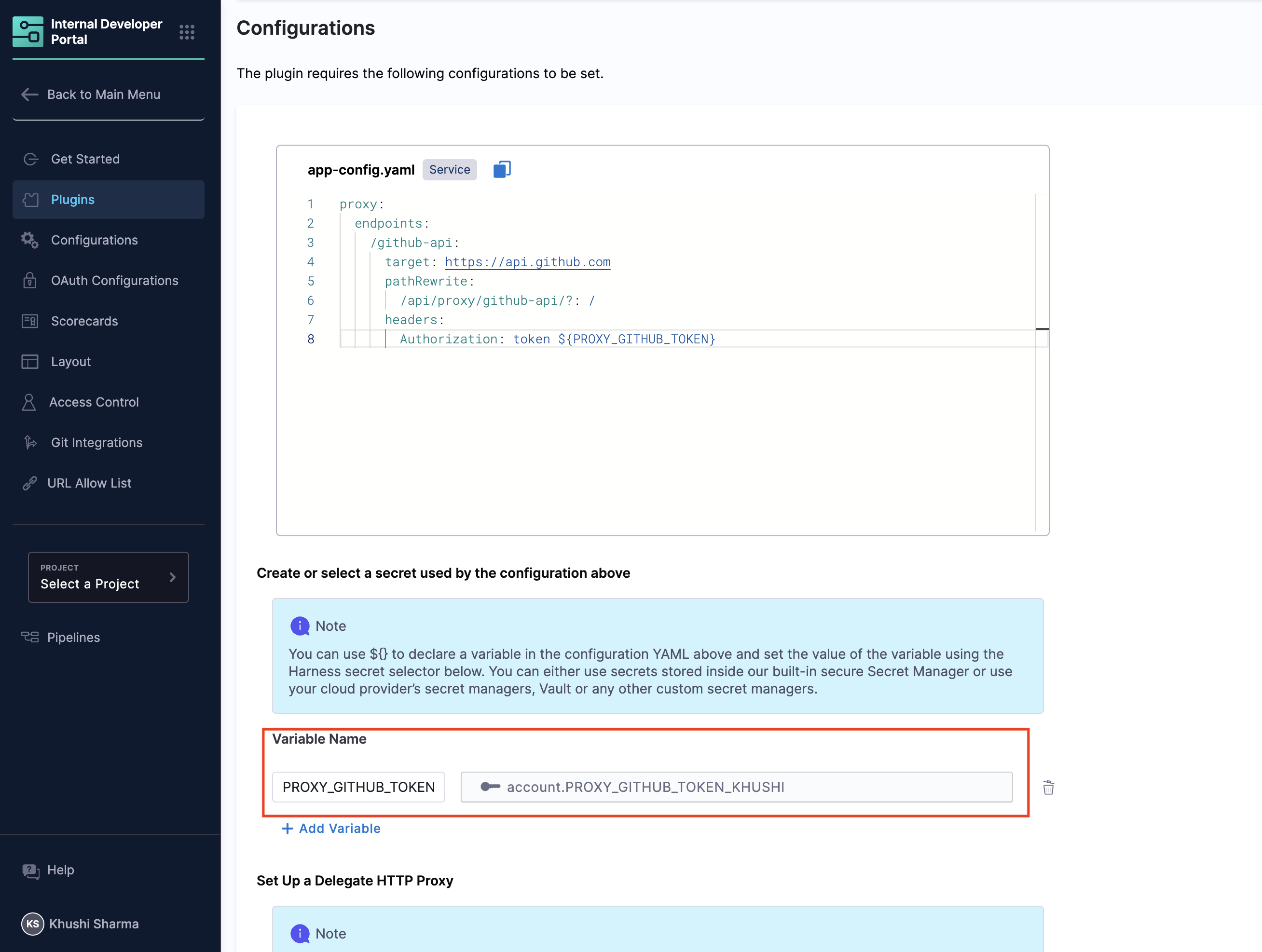 • A GitHub token is stored as a secret in Harness IDP for API authentication. You can add the token as a secret directly while creating a Backend Proxy.