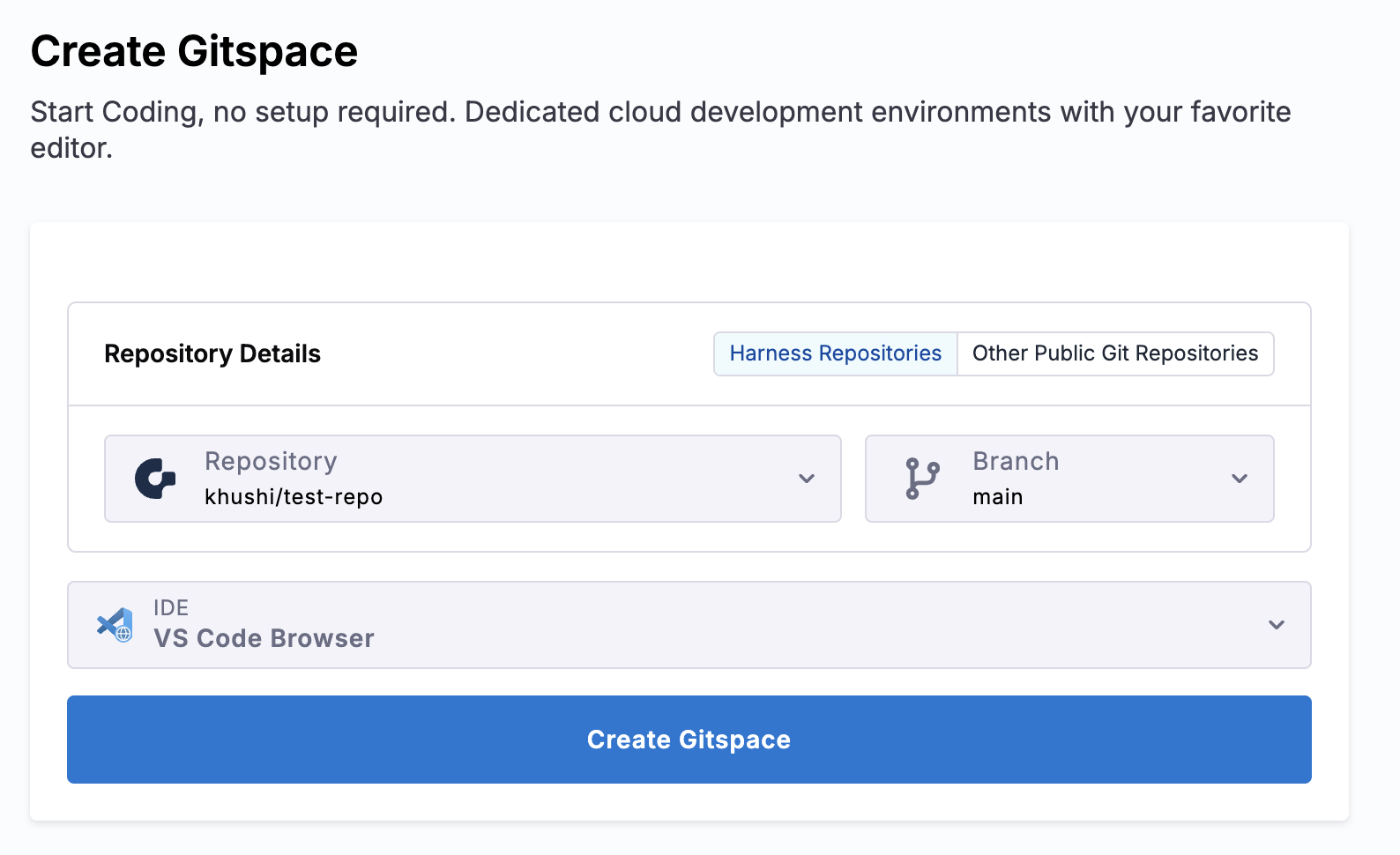 1. You can start by creating a new Gitspace from the Harness Open Source UI. (check the quickstart guide for more details) Please ensure that while creating one, you choose “VS Code Browser” as the selected IDE.