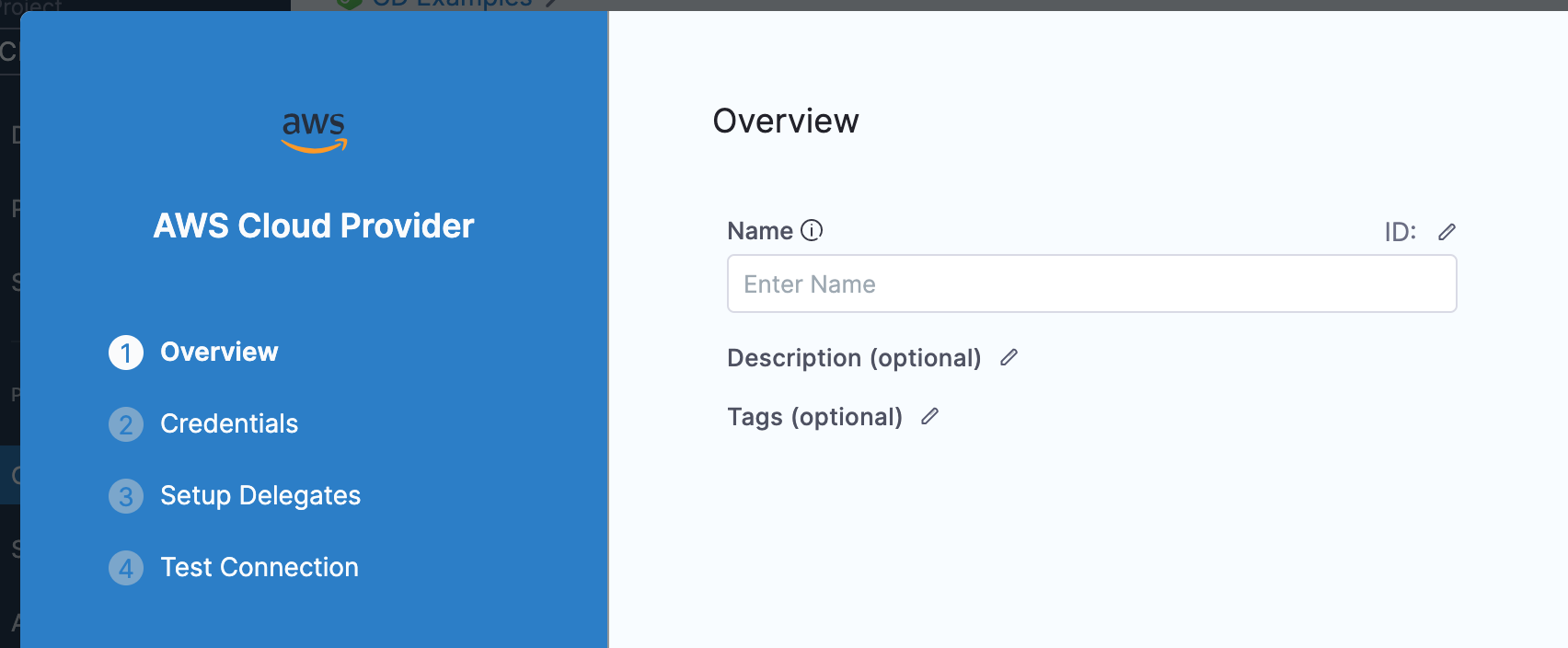 Input a Name for the connector. Description and Tags are optional. Harness automatically creates an Id (entity identifier) for the connector based on the Name.