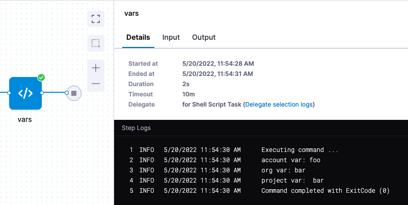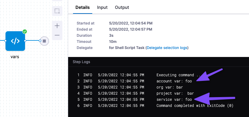 After the pipeline completes, verify that the step log message references the value you set for your account level variable.