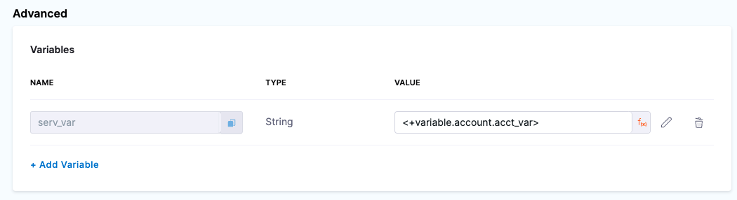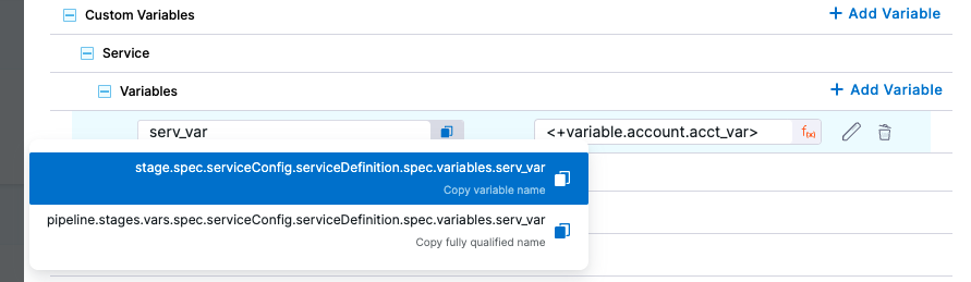 Define a variable in a pipeline, stage, step group, or other entity. For example, to define a service variable, select a stage with a service definition, select the Service tab, expand the Advanced section, and select New Variable.