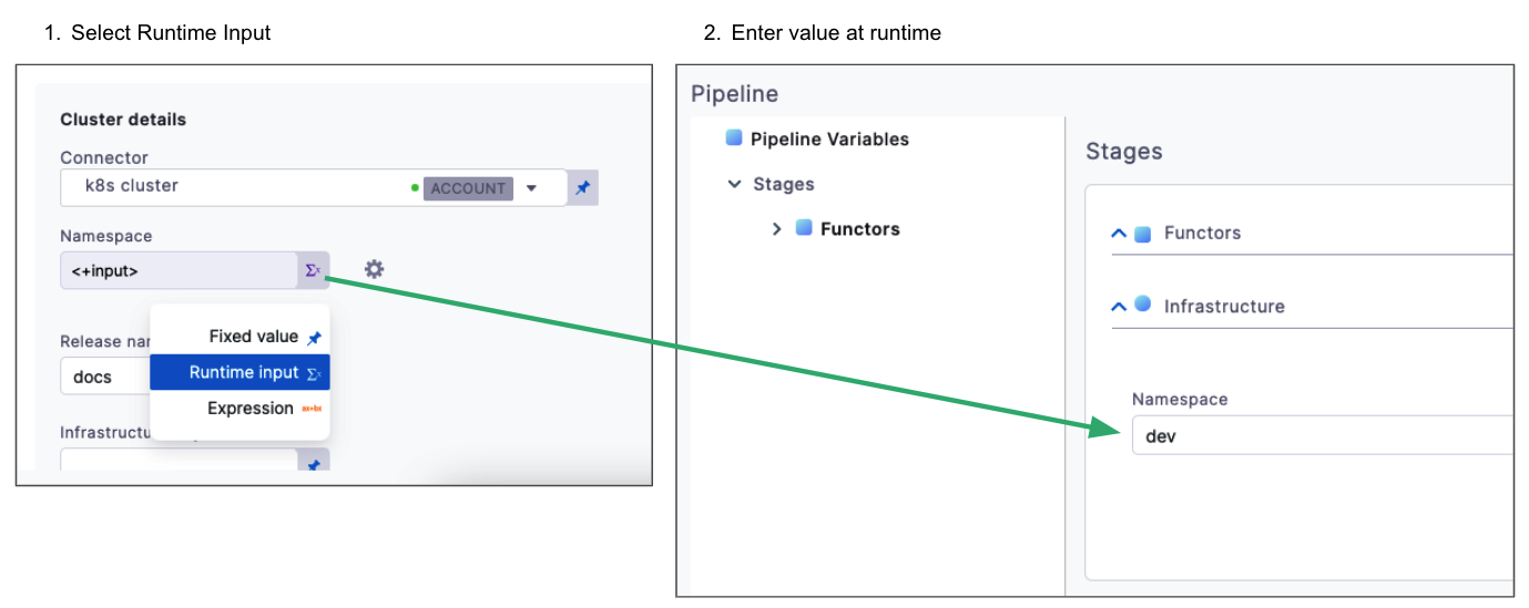For example, if you set the Kubernetes cluster Namespace setting to runtime input (<+input>), you'll need to provide the Namespace value when you run the pipeline.