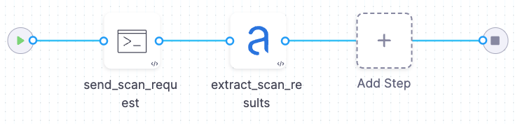 - A scan step runs in Extraction mode. When the custom scan finishes, the step extracts the results from the scanner API and correlates, deduplicates, and ingests the results.